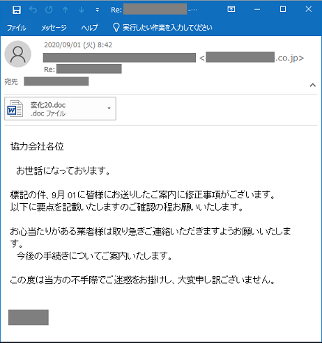 【出典】IPA:「Emotet」と呼ばれるウイルスへの感染を狙うメールについて- 図7 日本語の攻撃メールの例(2020年9月)